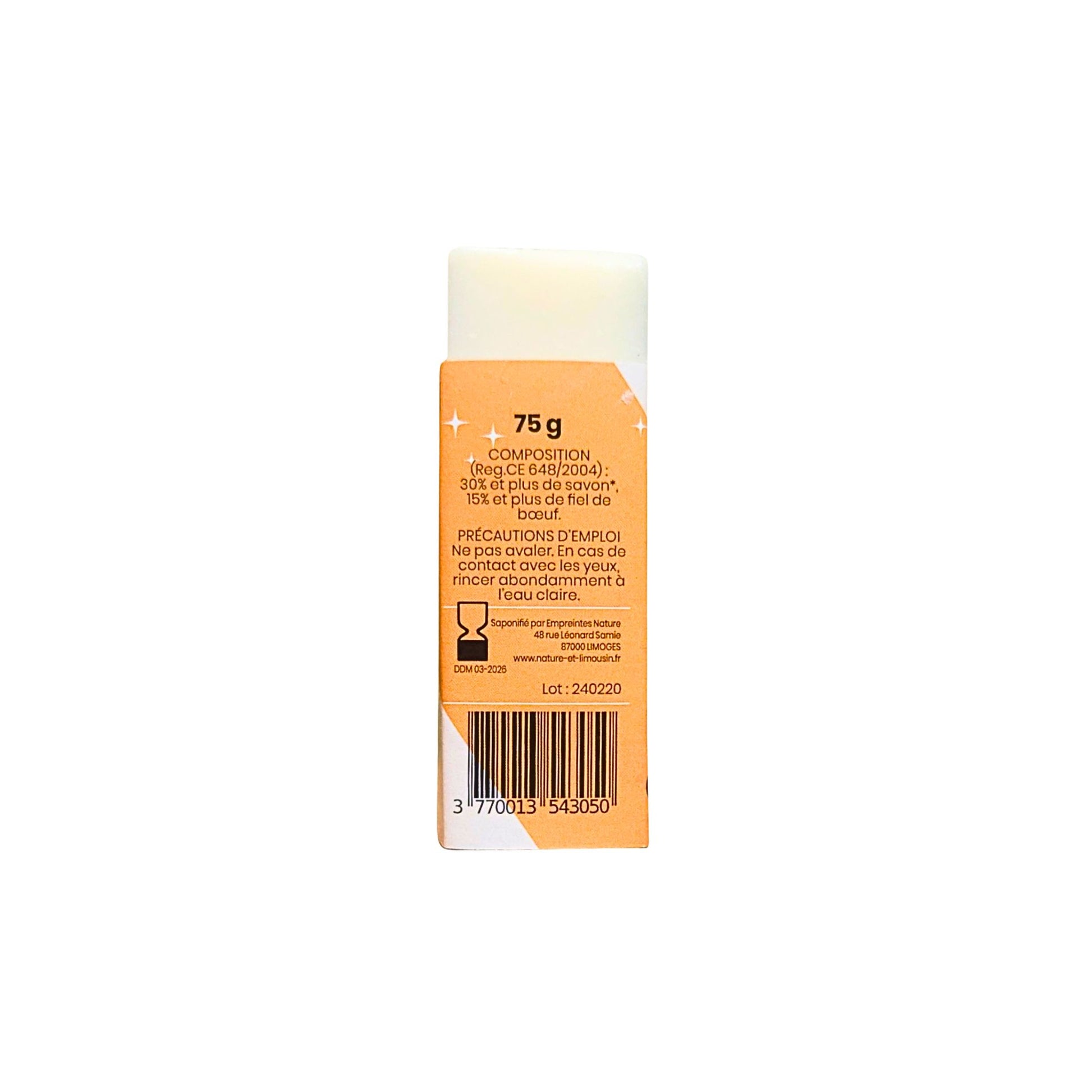 Caractéristiques ✔ Poids net : à préciser ✔ Dimensions : standard ✔ Ingrédients principaux : savon saponifié à froid, fiel de bœuf, huiles végétales bio