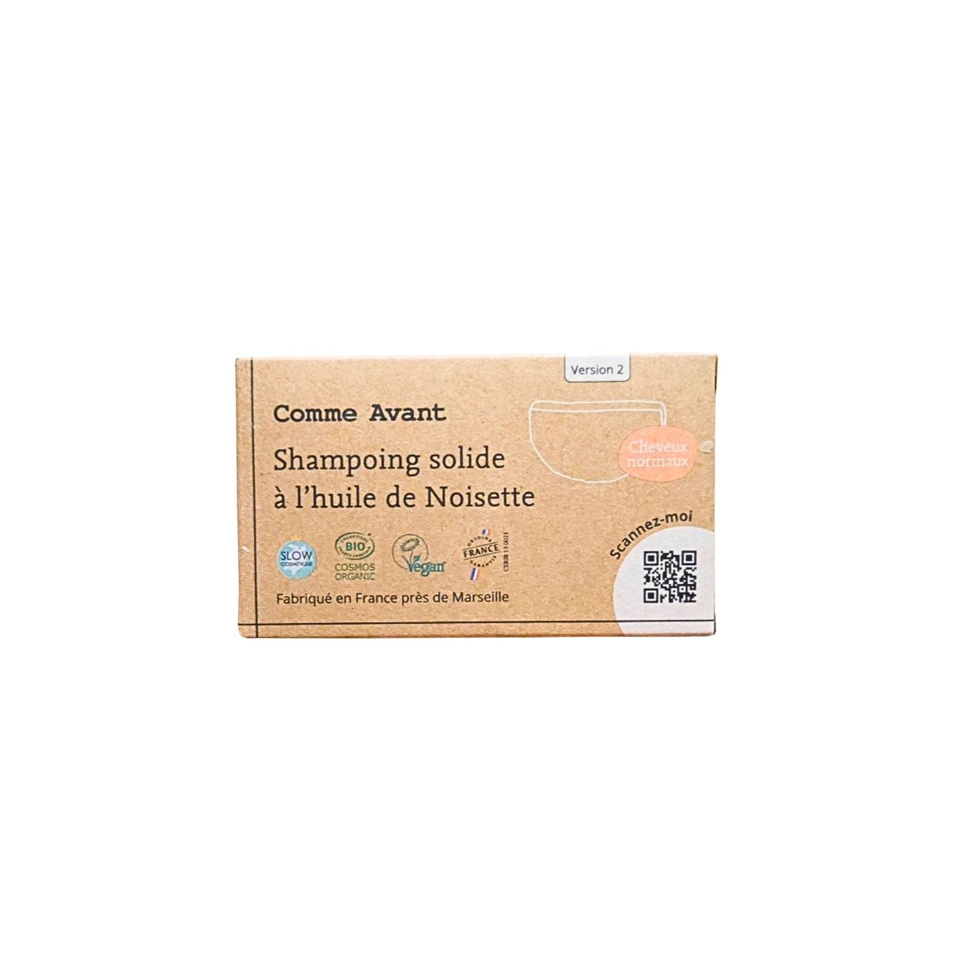 Shampoing solide COMME AVANT à l’huile de noisette bio : un soin doux et efficace pour tous types de cheveux. Ce shampoing, formulé sans produits chimiques, nettoie vos cheveux en douceur et les rend plus faciles à coiffer. Vegan, zéro déchet et biodégradable, il est aussi respectueux de l’environnement que de vos cheveux.